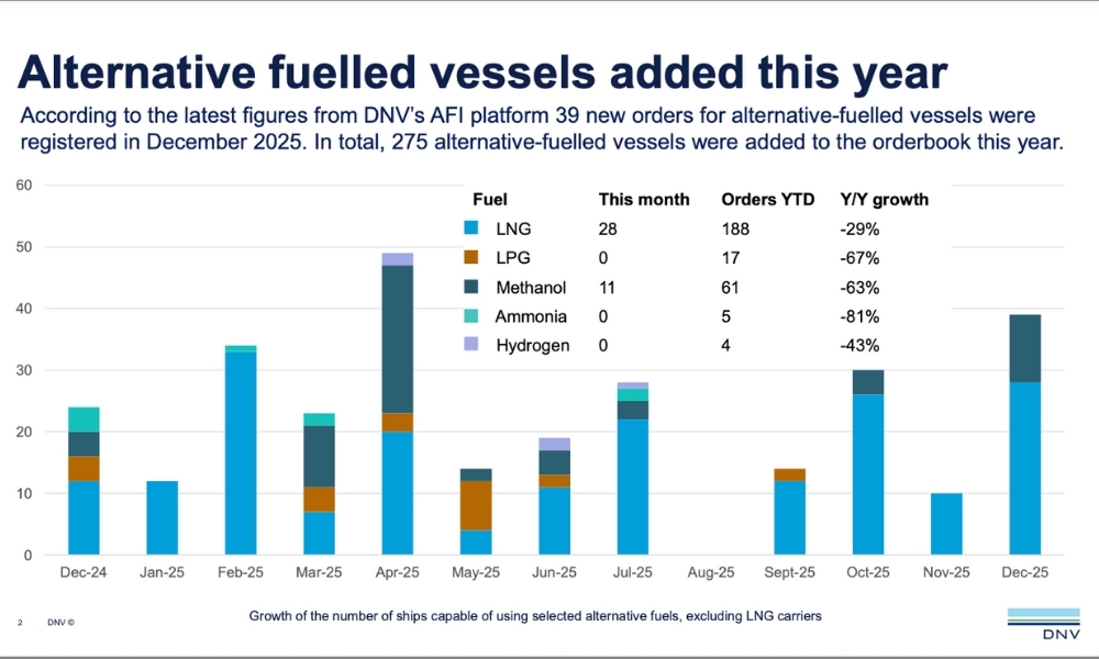 船级社DNV周一(1月12日)表示,其替代燃料洞察(AFI)平台发布的最新年度数据显示,2025年替代燃料船市场面临了监管不确定性和市场调整影响。