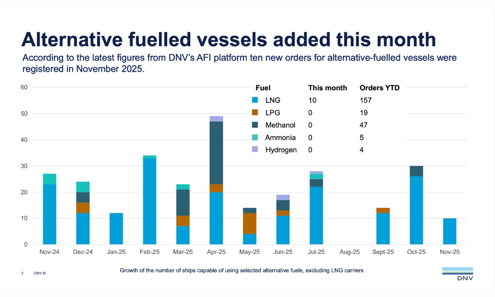 船级社DNV的替代燃料洞察(AFI)平台最新数据显示,2025年11月新增了10份替代燃料船订单。