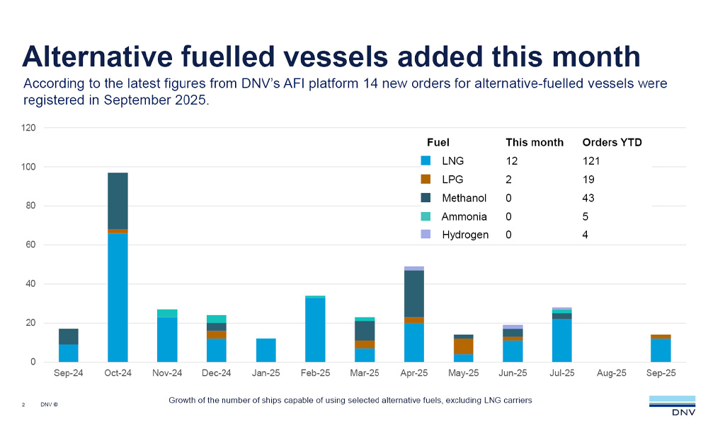 DNV船级社替代燃料洞察 (AFI) 平台的最新数据显示,2025年9月,以液化天然气 (LNG) 为燃料的新船订单占了替代燃料船订单的大多数。
