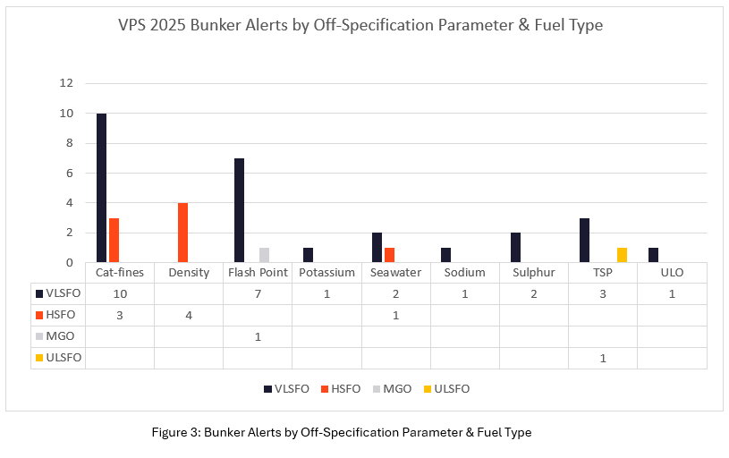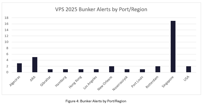 而在化石燃料方面,VPS在2025年发布了37个燃油警报,相对2024年增加了37%,其中,极低硫燃料油(VLSFO)是需发布最多警报的燃料类型,而新加坡,则是提供潜在问题燃料最频繁的港口/地区。 在8月份,VPS发现VLSFO中催化剂颗粒含量普遍偏高,而导致在美国东海岸、新加坡、阿尔赫西拉斯港和路易港等地发布了七份燃油警报,而催化剂颗粒含量则介于62ppm至176ppm之间。其中,这一问题凸显了采用燃油系统检测服务的重要性,以能够为船舶提供更高级别的保护并降低风险。此外,VPS也发现多起闪点问题,主要与馏分油有关,但VLSFO 和高硫燃料油(HSFO)也存在类似问题。