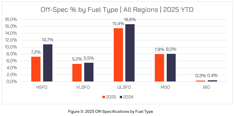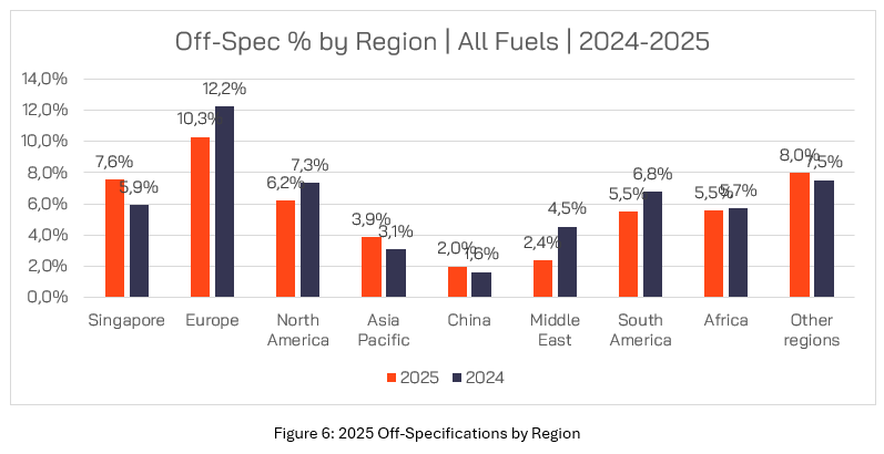 从区域来看,欧洲仍然是不合格燃油供应量最高的地区,尽管,2025年不合格燃油的比例较2024年有所改善,已从12.2%降至10.3%。相对地,新加坡的不合格燃油率却已从2024年的5.9%上升至2025年的7.6%。