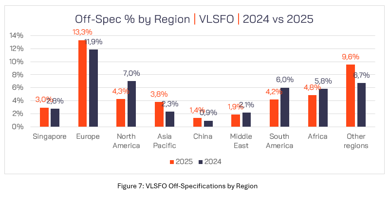 作为最广泛被使用的船用燃料类型,VLSFO 几乎占 VPS 测试燃料总量的一半。就质量而言,VLSFO 在 2025 年的不合格率达到 5.2%。而在这 5.2% 的不合格 VLSFO 之中,欧洲的不合格 VLSFO 占比均在 2025 年(13.3%)和 2024 年(11.9%)为最高。同时,作为特定区域,非洲不合格 VLSFO 占比位居第二,在2025 年的被测试燃料有 4.8% 至少存在一项不合格参数,而 2024 年的这一占比则为 5.8%。接下来,北美地区的不合格 VLSFO 占比位居第三,在2025 年达 4.3%,而在2024 年则为 7%。