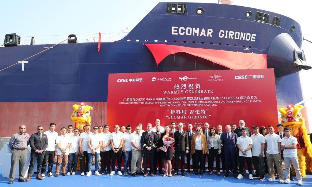 “ECOMAR GIRONDE”轮由中国广船国际(Guangzhou Shipyard International,简称GSI)建造,是一艘49,800载重吨的双燃料、甲醇动力中程化学品运输船,符合IMO II标准。