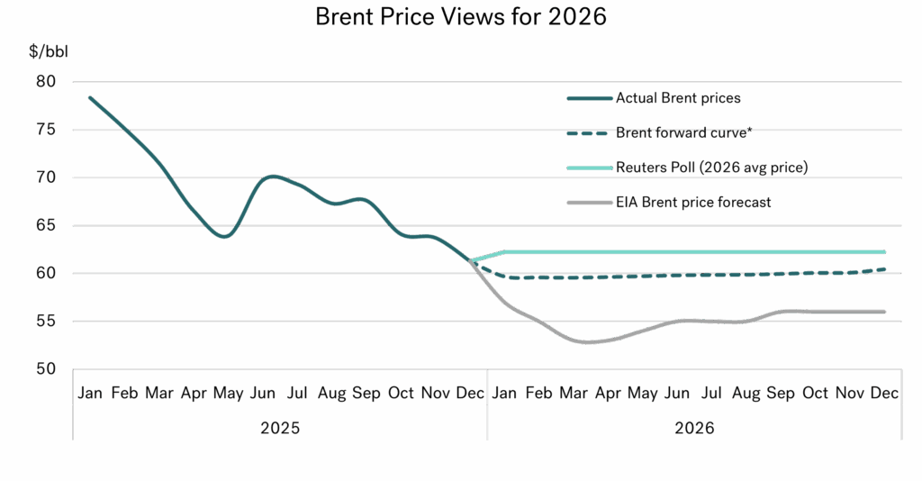 许多针对明年布伦特原油价格走势的已公布预测都介于每桶55-60美元之间,而在此,我们重点标注了美国能源信息署(EIA)的预测,因为,它是数值较低的预测之一。而另一条标注线,就是路透社向35位经济学家和分析师咨询的结果,该调查显示,明年布伦特原油的年均价格为每桶62美元。显然,作为平均值,一些参与者的预测会高于每桶62美元,而另一些则会低于这个数字,但,主线焦点仍是2026年油价将保持低位。