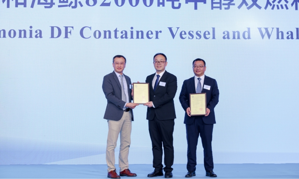 中国船级社已向中船黄埔文冲自主研发的鸿鹄3500TEU氨双燃料集装箱船和海鲸82000吨甲醇双燃料散货船颁发原则性认可(AIP)证书。