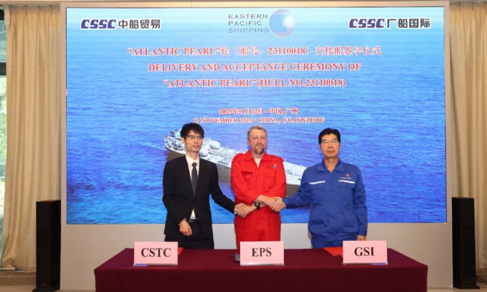 广州广船国际股份有限公司(Guangzhou Shipyard International,简称GSI)已于近日成功交付“Atlantic Pearl”油轮,是其为新加坡东太平洋航运公司(EPS)建造的11.1万吨LNG双燃料原油/成品油轮首制船。