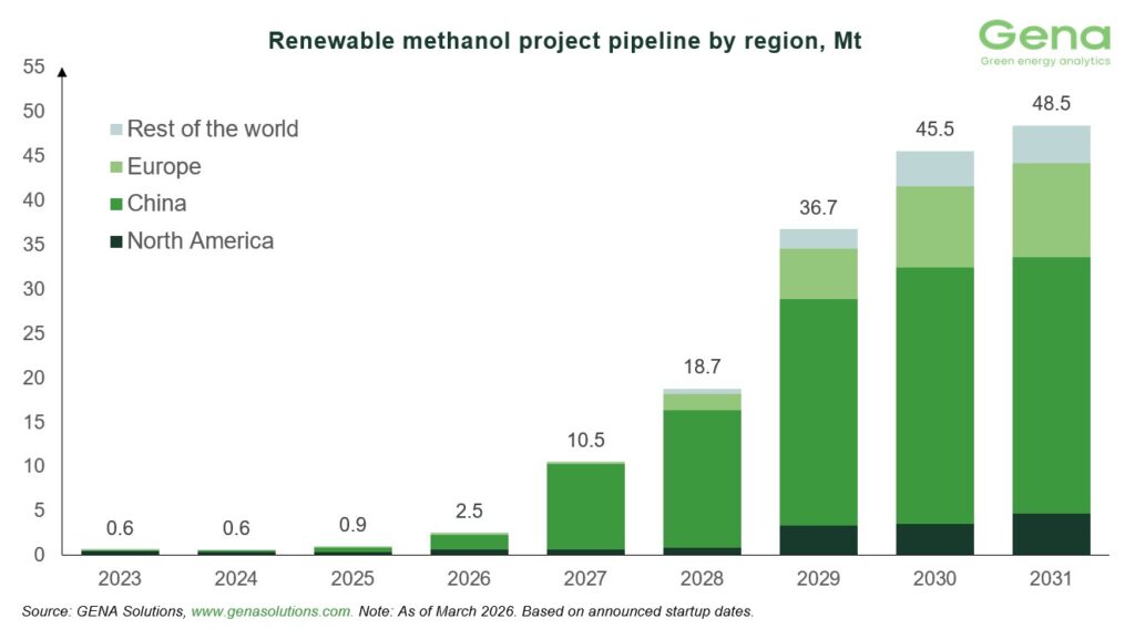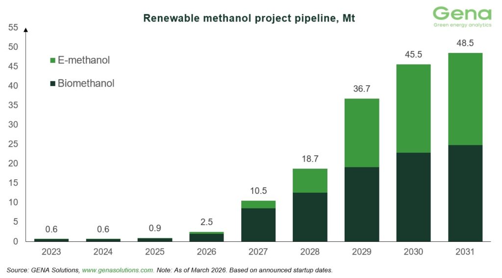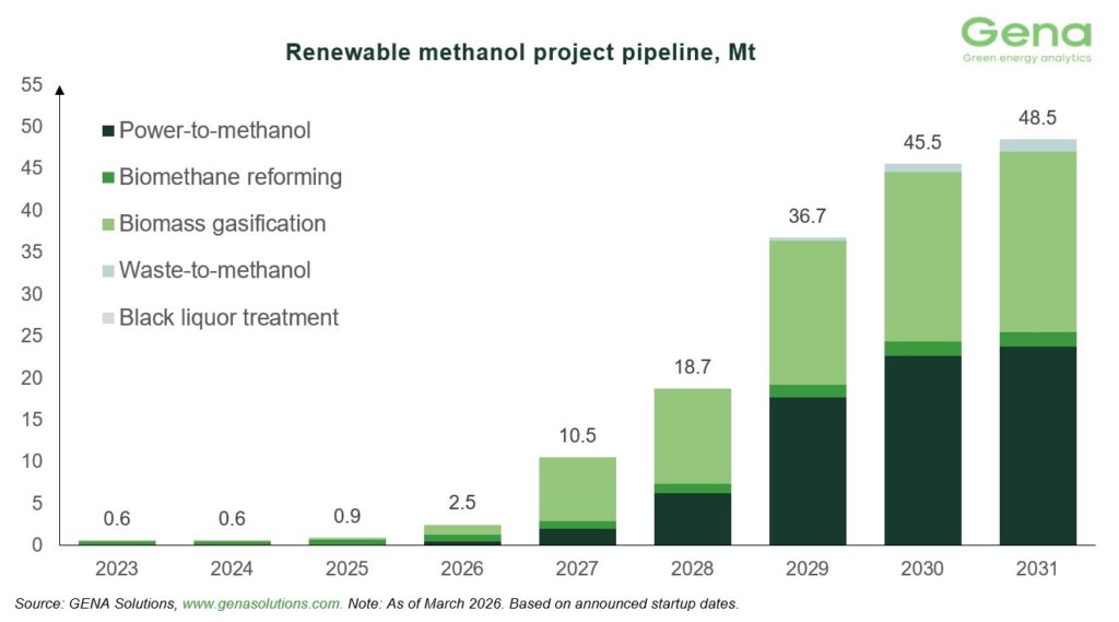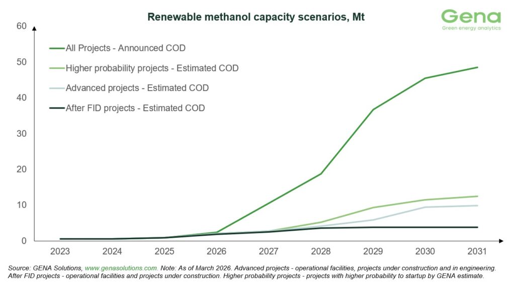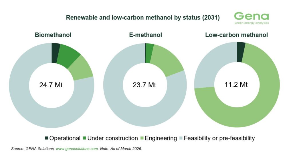 全球甲醇行业协会(Methanol Institute,简称MI)近期向《满航》(Manifold Times)分享了GENA Solutions Oy公司2026年3月的可再生和低碳甲醇项目储备报告。