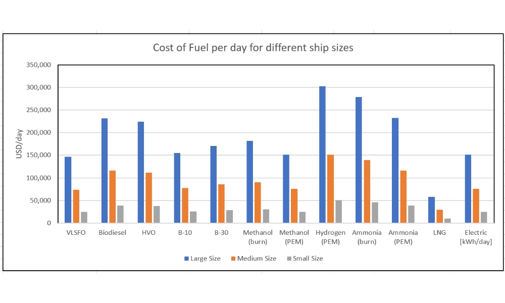 该研究由 Blend Tiger 的 Eliseo Curcio 撰写,其中比较了各种替代船用燃料在不同大小船舶(从最大的远洋船到较小的区域船)上的可行性。