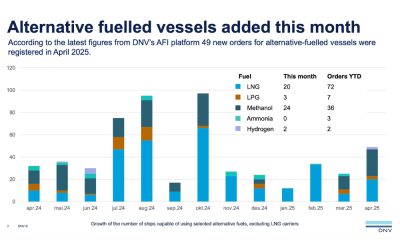在4月,甲醇和LNG新船订单数量相近,在49份新船订...