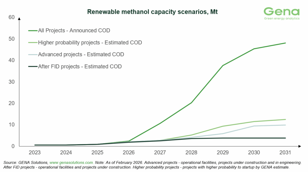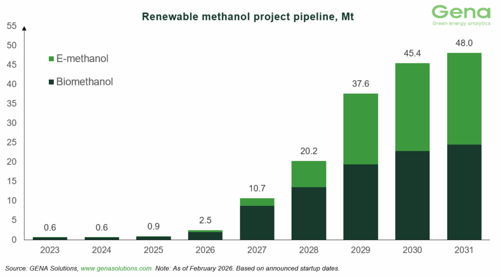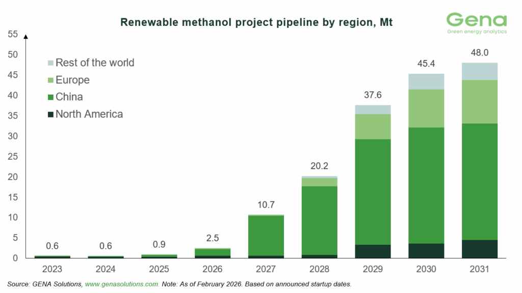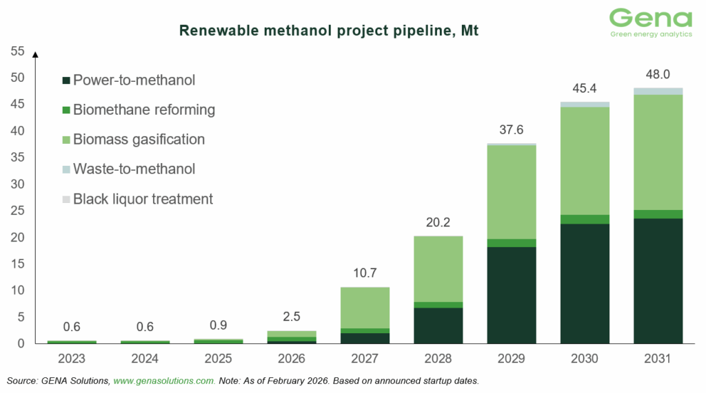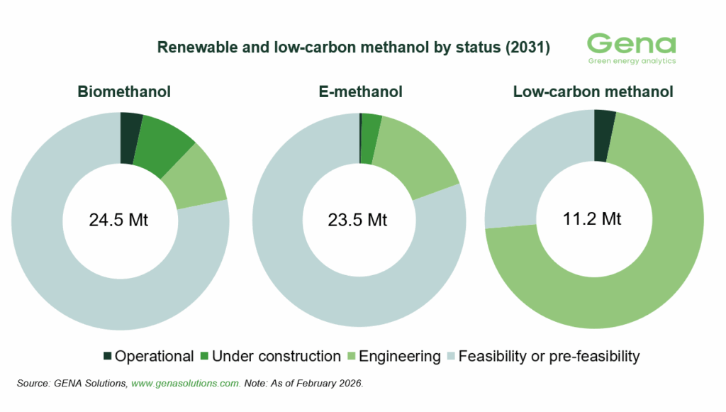 全球甲醇行业协会(Methanol Institute,简称MI)近期与《满航》(Manifold Times)分享了由GENA Solutions Oy发布的2026年2月可再生和低碳甲醇项目储备报告。