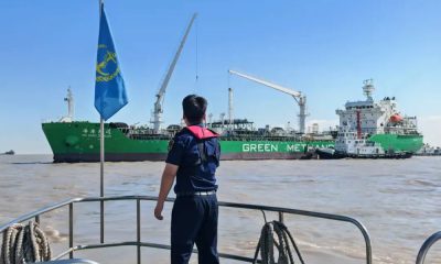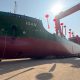 加注船“海港致远”在上海中远海运重工长兴岛基地码头向...