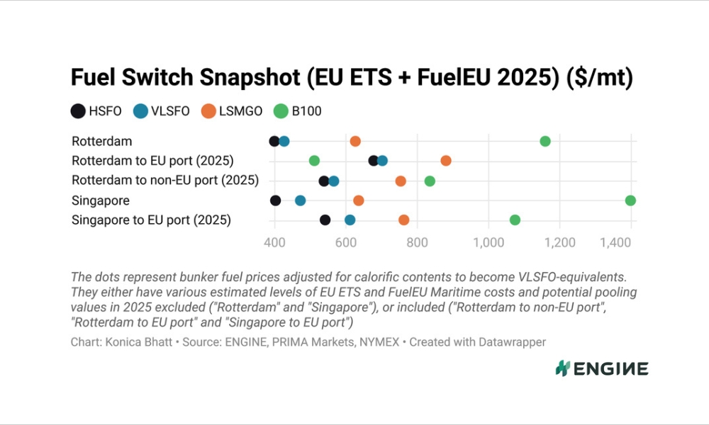 鹿特丹B100价格相对VLSFO价格已下跌;新加坡B...